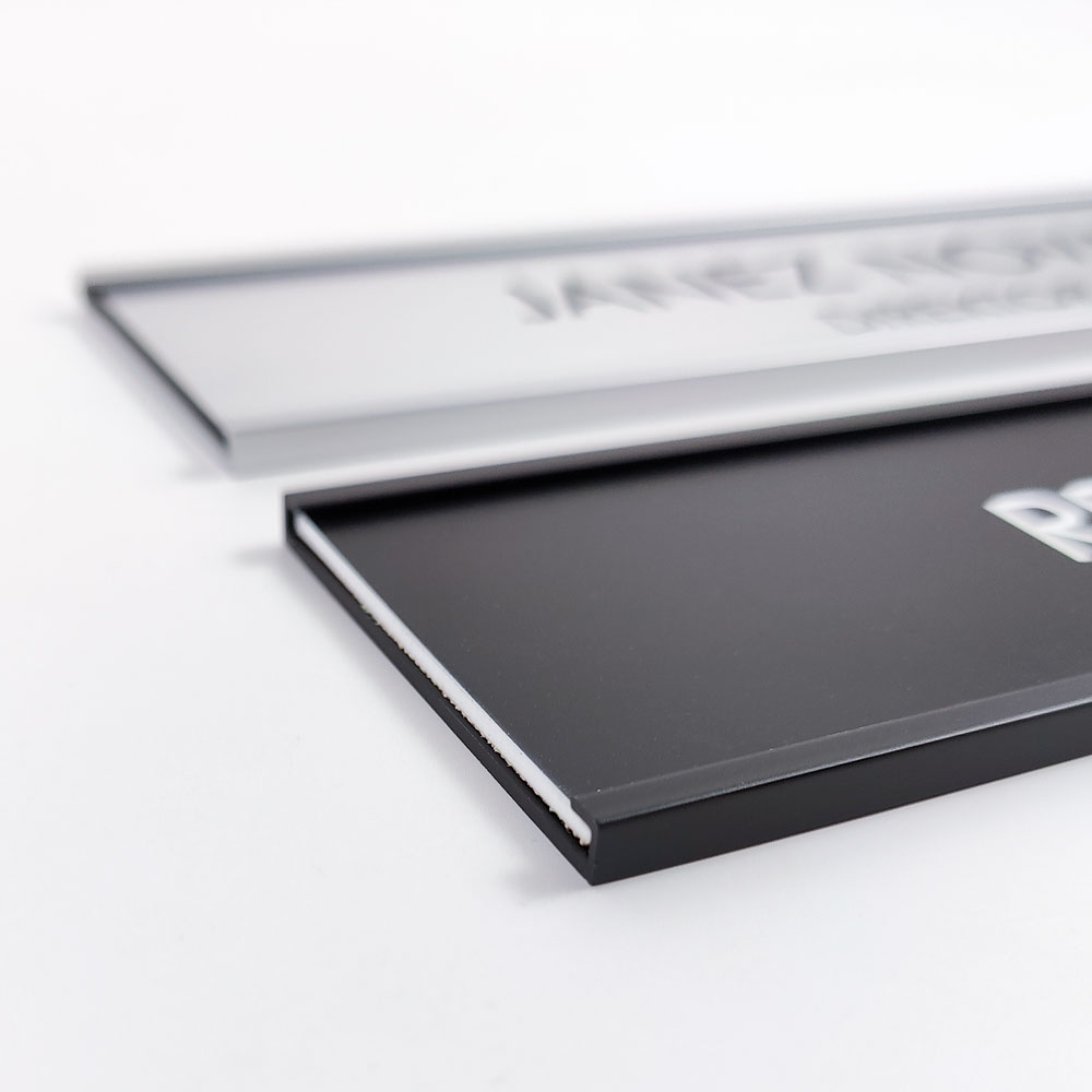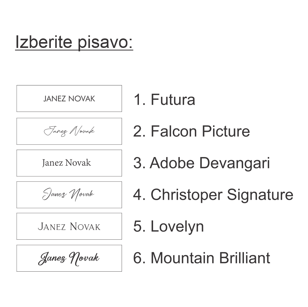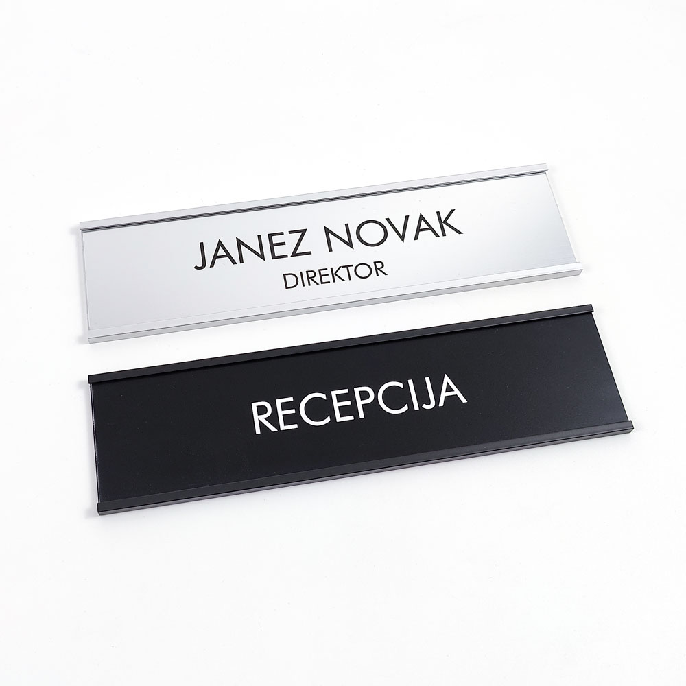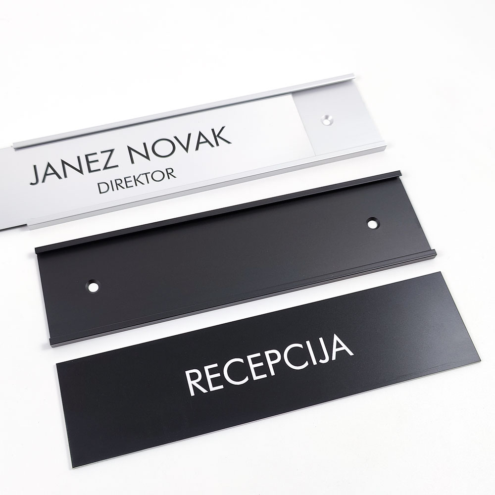 Ali iščete elegantno in prilagodljivo rešitev za označevanje vrat vašega doma ali poslovnega prostora? Predstavljamo vam našo aluminijasto tablico za vrata – vrhunski izdelek, ki združuje estetiko, trajnost in prilagodljivost. Okvir tablice je izdelan iz kakovostnega aluminija, ki je trpežen in odporen na vremenske vplive. To zagotavlja, da bo vaša tablica ostala lepa in funkcionalna tudi v zahtevnih pogojih. Tablica, ki se lahko vstavi je narejena iz trpežne umetne mase, ki je na voljo v različnih barvnih kombinacijah. S tem boste izbrali barvo, ki se najbolje ujema z vašim okoljem ali obliko, ki izraža vašo osebnost. Na tablico vam vgraviramo napis po vaših željah. To pomeni, da lahko na enostaven način označite svoj dom, pisarno ali trgovino.