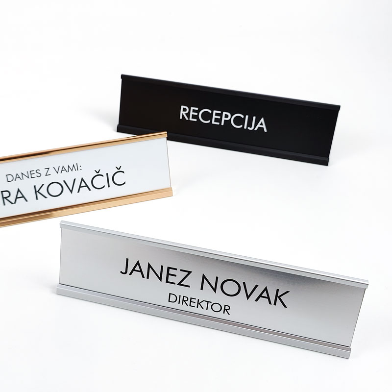 Iščete popolno rešitev za dodatek v vaši pisarni ali želite podariti nekaj res posebnega svojim sodelavcem ali strankam? Predstavljamo vam namizno tablico po meri, ki bo zagotovo izstopala v vsakem okolju. Ta prestižen izdelek je izdelan iz aluminija in nudi možnost personalizacije, kar ga naredi edinstvenega. Izdelana je iz visokokakovostnega aluminija in je na voljo v 3 barvah. Poleg izbire barve okvirja imate prav tako možnost izbire barve tablice, ki se vstavi v okvir. Na voljo so 4 elegantne možnosti: srebrna s črno gravuro, zlata s črno gravuro, bela s črno gravuro in črna tablica z belo gravuro.