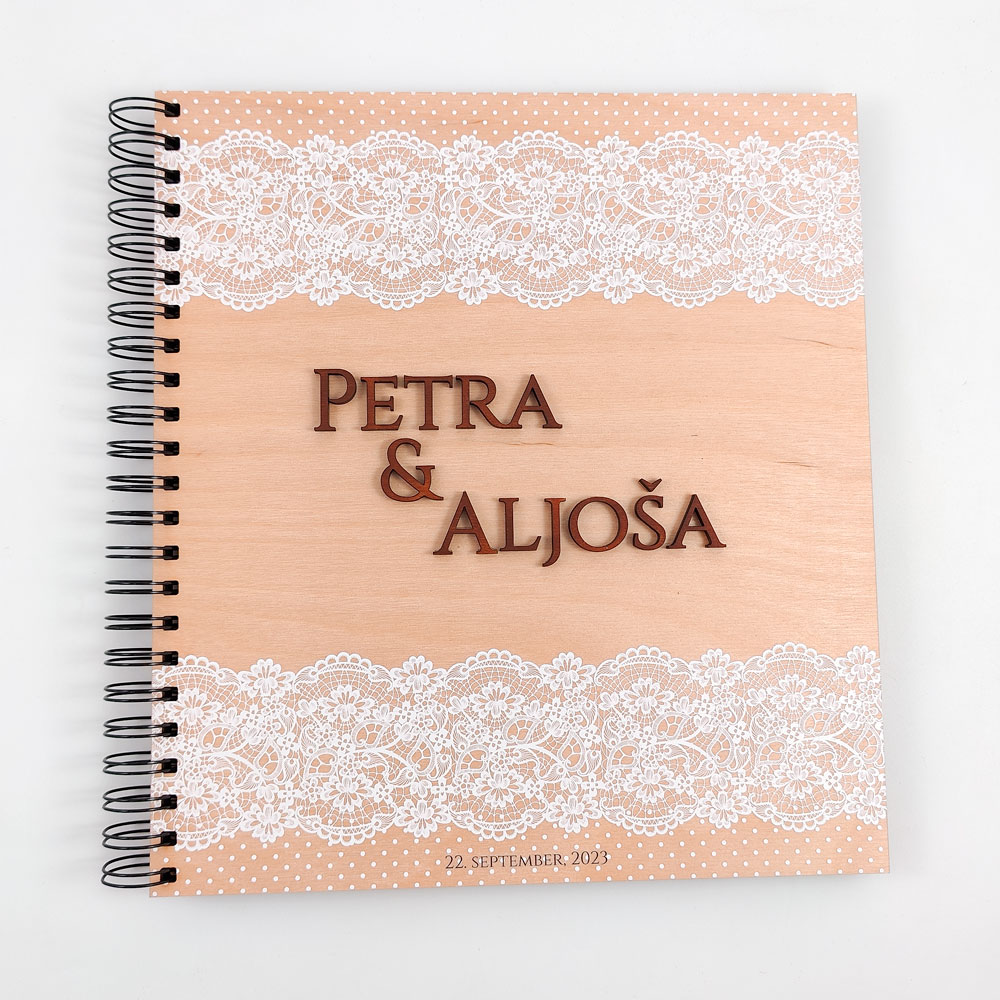 Ohranite svoje dragocene spomine na poseben način s personaliziranim foto albumom čipka. Ta izjemen album združuje čar lesa, umetnost čipke ter vašo osebno noto, da ustvari nepozabno doživetje. Unikatne lesene platnice albuma so okrašena z natančno izdelanim motivom čipke, ki doda izdelku pridih elegance. Vaša izbrana imena ali posebno sporočilo so lasersko izrezani, kar jim daje 3D videz in edinstveno privlačnost. Na voljo sta dve velikosti – manjši album za do 120 fotografij in večji album za do 240 fotografij, da lahko shranite svoje spomine. Črne strani albuma poudarijo barve vaših fotografij in jim dajo kontrast. Vsak album je ročno izdelan in prilagojen vašim željam, kar ga naredi edinstvenega.