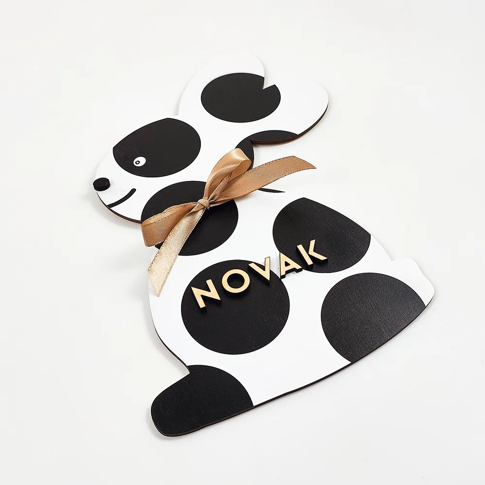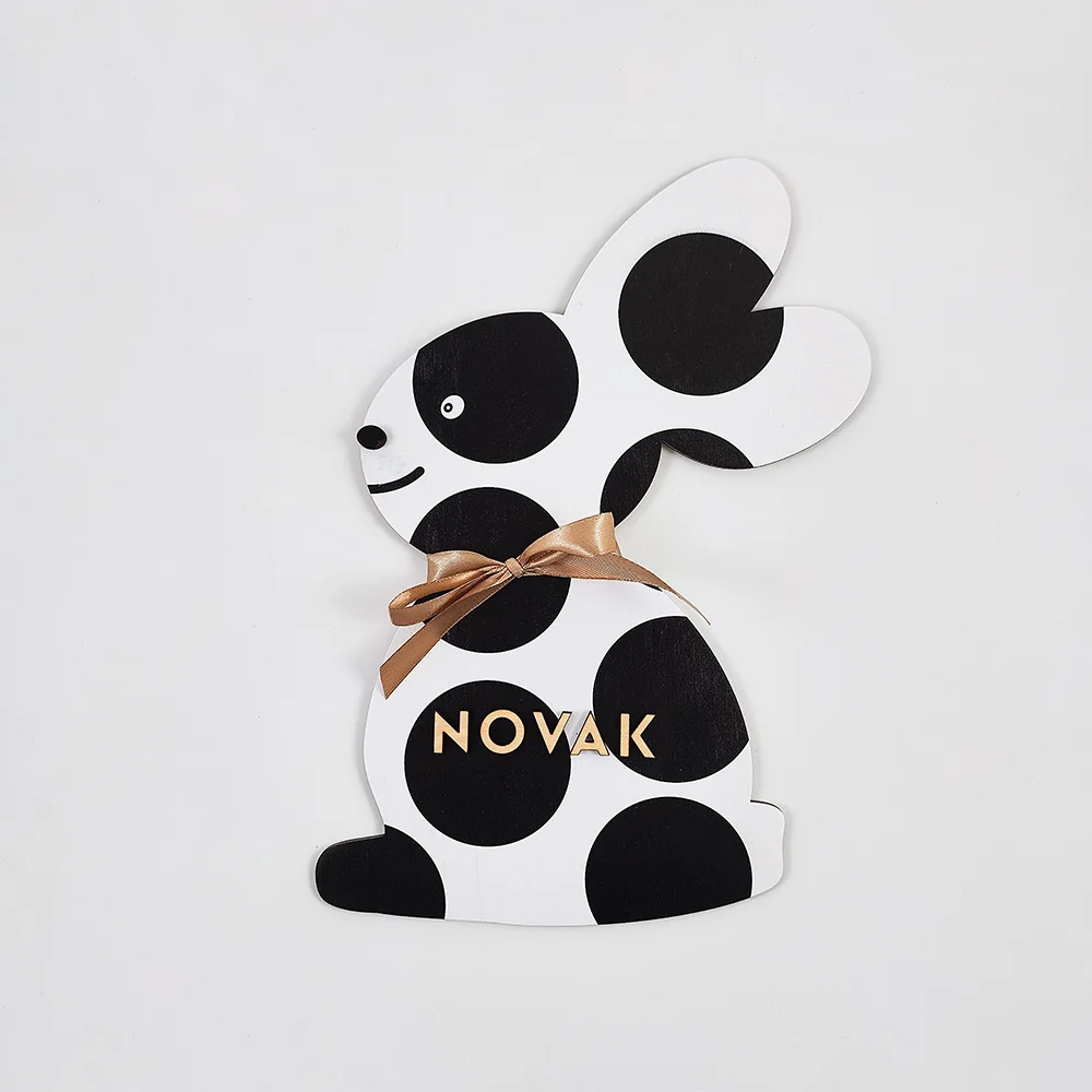 Dodajte osebno noto svoji velikonočni dekoraciji s prikupno tablico v obliki zajčka z imenom po meri. Izdelana iz kakovostnega lesa in ročno poslikana v igrivem črno-belem pikčastem vzorcu, ta zajček prinaša veselje in praznični šarm v vsak kotiček doma.