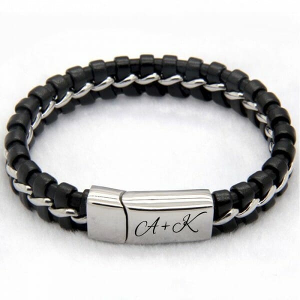 Nakit je darilo, ki ga podarimo ob posebni priložnosti. Dodajte nakitu lasten dotik gravure osebnega besedila. Tako darilo je edinstveno in bo sigurno pričaralo nasmeh na obrazu vašega partnerja. Zapestnica je izdelana iz nerjavečega jekla in usnja. Lasersko graviranje pa bo zagotovilo, da bo vaše besedilo še dolgo obstojno na zapestnici. Preprosto vnesite želene inicialke in izberite pisavo in izdelali vam bomo kakovostno darilo, ki ga lahko podarite svojemu partnerju ali prijatelju.